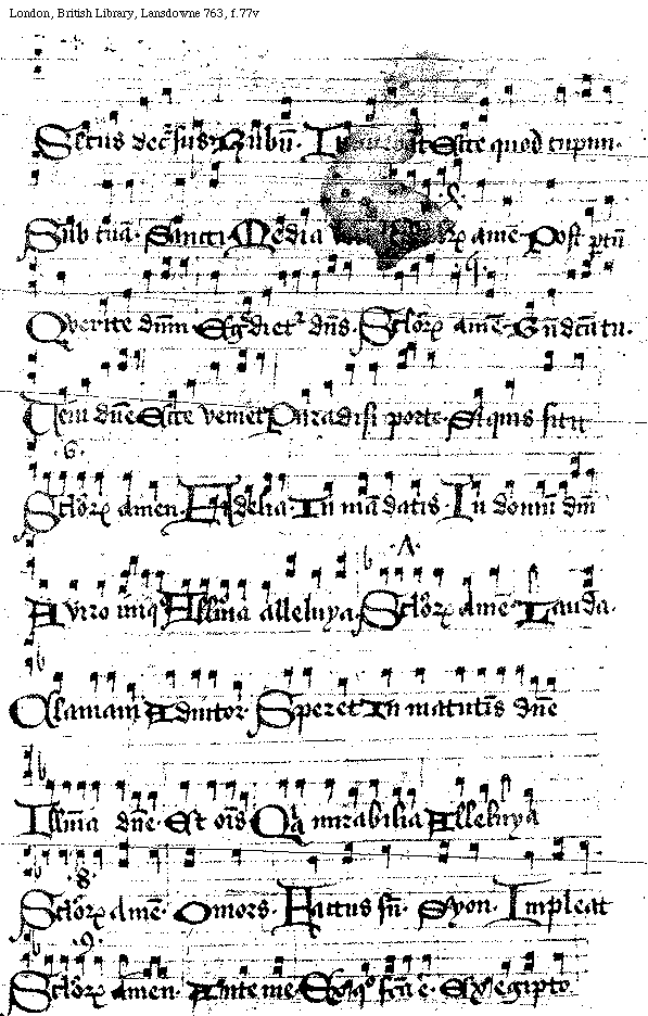 [f.[[76]]77v][London, British Library, Lansdowne 763, f.77v; text: Secus decursus. Rubum. In..ebant, Ecce quod cupiui. Sub tuam. Sancti. Media vita, quarta, Seculorum Amen, Post partum, Querite dominum. Egredietur dominus, quinta, Benedicam tu. Veni domine, Ecce veniet, Paradisi porte. Si quis sitit, sexta, Fidelia. In mandatis. In domum domini, A viro iniquo, Alleluya Alleluya. septima, Lauda. Clamaui. Adiutor. Speret, In matutinis domine, Illumina domine. Et omnis. Quia mirabilia, Alleluya, octaua, O mors. Factus sum. Syon. Impleat, nona, Ante me. Ex quo facta est. Ex Egipto]