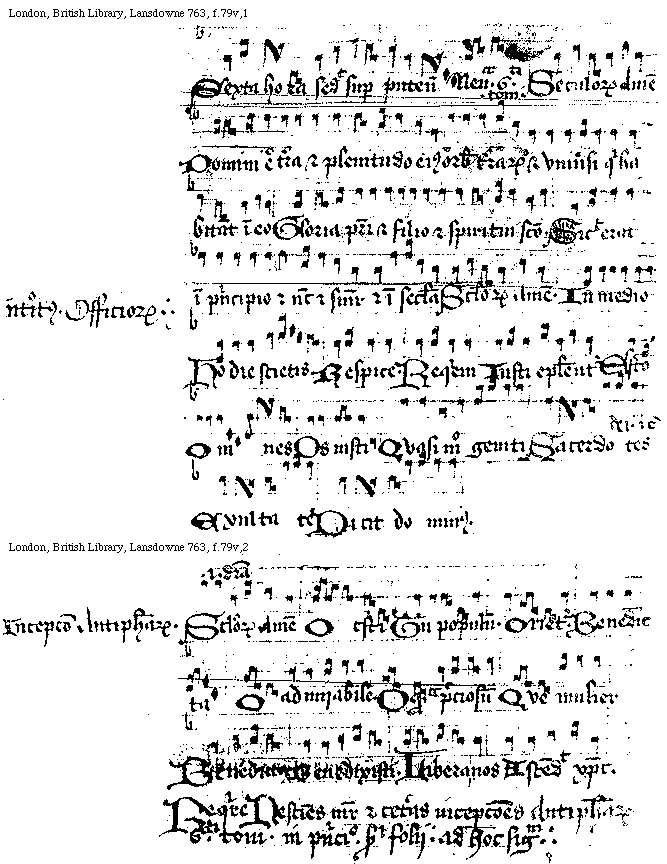 [f.[[78]]79v][London, British Library, Lansdowne 763, f.79v,1; text: Sexta hora sedit super puteum Neuma sexti toni. Seculorum Amen Domini est terra et plenitudo eius orbis terrarum et vniuersi qui habitant in eo Gloria patri et filo et spiritui sancto. Sicut erat in principio et nunc et semper et in secula Seculorum amen. Introitus. Officiorum. In medio, Hodie scietis. Respice. Requiem, Iusti epulentur, Esto, Omnes, Os iusti, Quasimodo geniti, Sacerdotes, dei et cetera. Exultate, Dicit dominus.]