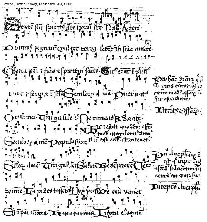 [London, British Library, Lansdowne 763, f.80r; text: Septem sunt spiritus ante tronum dei. Neuma septimi toni. Dominus regnauit exultet terra. Letentur insule multe. Gloria patri et filio et spiritui sancto. Sicut erat in principio et nunc et semper et in secula Seculorum amen. prima, Per hanc differenciam que s...am. peritis cantoribus ca...citur modus officiorum si... hic ostenditur, Introitus Officiorum. Puer natus, Oculi mei. Viri Galilei. Ne timeas, Adorate. Hic restat quoddam officium quod irregulariter dicitur set tamen vsum ecclesiastico tenetur. secunda, Populus syon. Prima Antiphonarum d... est que incipit in g . ascendit sillabatim in ... acutam vt patet hic. Incepcio Antiphonarum. prima differencia Seculorum Amen, Viri Galilei, Salutem, Redempcionem, Veni domine. Lapides torrentes, Nox precessit, De celo veniet, Erumpant montes. In matutinis. Iuxta eloquium]