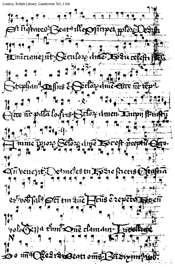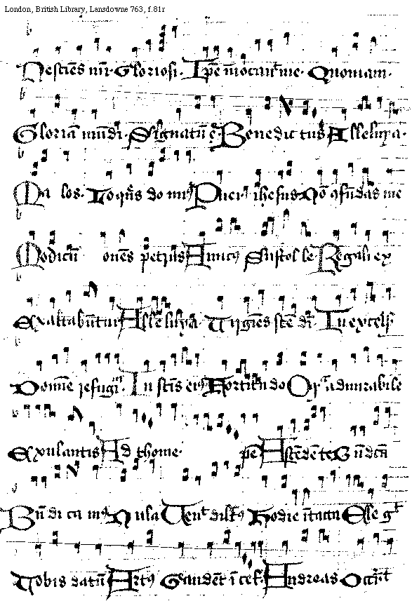 [f.[[80]]81r][London, British Library, Lansdowne 763, f.81r; text: Nesciens mater, Gloriosi. Ipse inuocauit me. Quoniam. Gloriam mundi. Signatum est. Benedictus. Alleluya. Malos. Loquens dominus, Puer Ihesus. Non confundas me, Modicum, Ponens Petrus, Amicus, Sustolle. Regali ex, Exaltabuntur. Alleluya. Virgines sancte dei. In excelsis, Domine refugium. In sanctis eius, Fortitudo, O quam admirabile, Exultantis, Ad thome. Opem. Ascendente, Benedicam, Benedicamus, Nula, Venter dilectus, Hodie intactu, Elegit, Vobis datum, Artus, Gaudent in celis. Andreas, Occurrit]