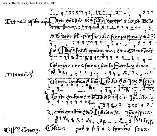 [f.[[80]]81v][London, British Library, Lansdowne 763, f.81v; text: Intonacio Psalmorum. Dixit dominus domino meo. sede a dextris meis. Benedictus dominus deus Israel. quia visitauit et fecit redempcionem plebis sue. Magnificat. Anima mea dominum. Sicut erat in principo et nunc et semper et in secula Seculorum Amen. Inuitatoria tria. Venite exultemus domino. Iubilemus ei. Ipse conspicit, Venite exultemus domino. Iubilemus ei. Ipse conspicit, Venite exultemus domino. Iubilemus ei. Ipse conspicit. Versus Responsoriorum. Gloria patri et filio et spiritui sancto.]
