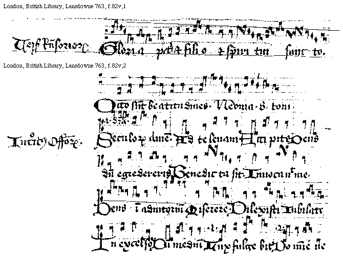 [f.[[79]]80v][London, British Library, Lansdowne 763, f.80v; text: Vidit [Iacob add. supra lin.] scalam summitas eius. Sponsus, Crux alma, Considerabam. Constitues eos, Electi sunt in Christo, Te gloriosus. Iherusalem. In domino. Sicunt infantes, Accipite. te. Si manseritis, Si cognouissetis. me, Saluator. secunda, Seculorum Amen. Natiuitas est. Ingressa Agnes, Dextram meam et collum meum cinxit, Omnes, Si vere fratres. Domine labia mea. In tribulacione, Proprio. Liberauit. Caro mea, .auis enim dei est. Domine, Voce mea, Iustus dominus. Me suscepit. Qualis est dilectus. tercia, Exortum est. Ingressus [Paulus add. supra lin.], Vide domine, Misit dominus, quarta]