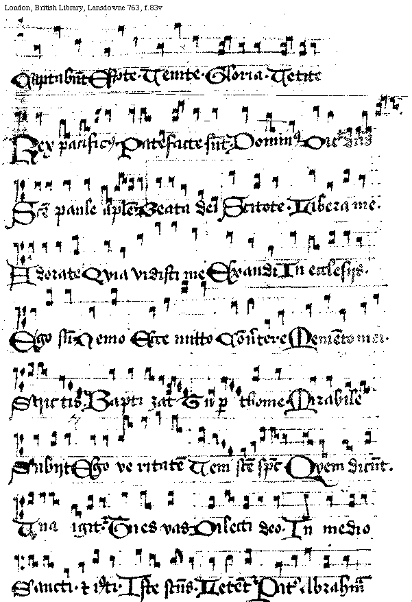 [f.[[82]]83v][London, British Library, Lansdowne 763, f.83v; text: Captabunt. Estote. Venite. Gloria. Vetite, Rex pacificus. Patefacte sunt. Dominus, Dicit dominus, Sancte paule apostole. Beata dei, Scitote. Libera me. Adorate, Quia vidisti me. Exaudi. In ecclesijs. Ego sum. Nemo, Ecce mitto, Conuertere, Memento mei. Strictis. Baptizat, Tu per thome. Mirabile, Subijt, Ego veritatem, Veni sancte spiritus, Quem dicunt. Vna igitur. Tu es vas, Dilecti deo, In medio, Sancti. et iusti. Iste sanctus. Letentur, Pater Abraham]