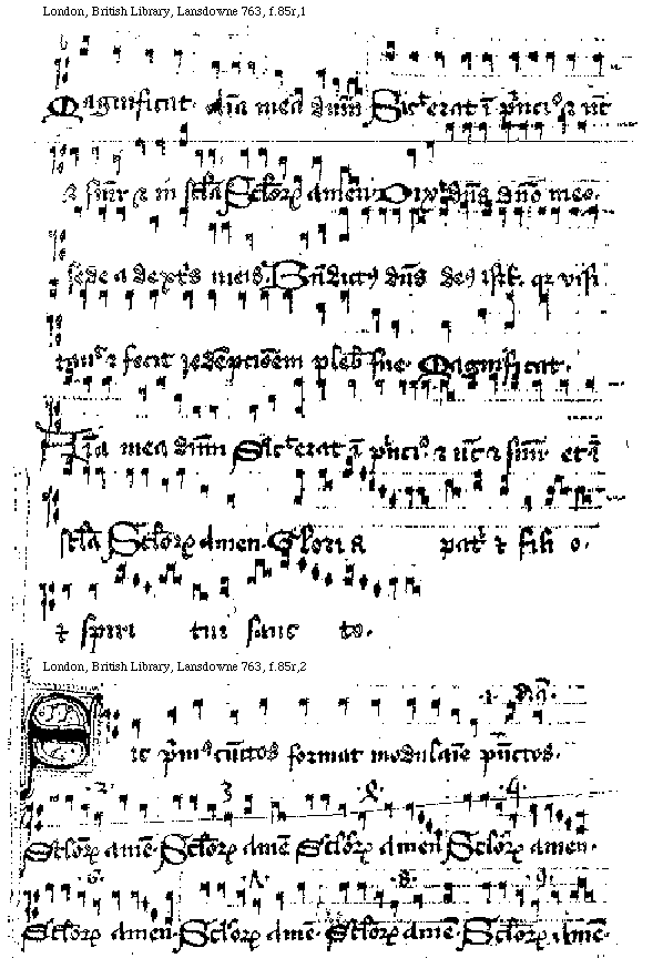 [f.[[84]]85r][London, British Library, Lansdowne 763, f.85r,1; text: Magnificat. Anima mea dominum Sicut erat in principio et nunc et semper et in secula Seculorum Amen. Dixit dominus domino meo. sede a dextris meis. Benedictus dominus deus Israel. quia visitauit et fecit redempcionem plebis sue. Gloria patri et filio. et spiritui sancto.]