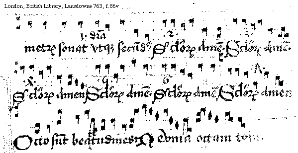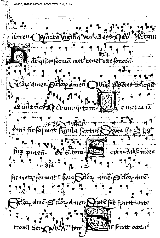 [f.[[85]]86r][London, British Library, Lansdowne 763, f.86r; text: Amen. Quarta Vigilia venit ad eos. Neuma quarti toni. Hanc quintus formam metri tenet ecce sonoram. prima differencia, secunda, Seculorum Amen, tercia, Quinque prudentes intrauerunt ad nupcias Neuma quinti toni. Vt metra iam primus sic format singula sextus, prima differencia et vltima, Sexta hora sedit super puteum. Neuma sexti toni. Septimus absque mora sic metrum format in hora, quarta, quinta, Septem sunt spiritus ante tronum dei. Neuma septimi toni. Sic sonat octauus]