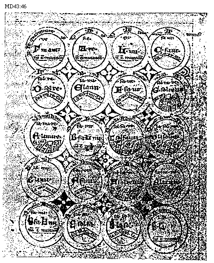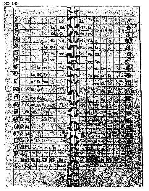 [MD43:43; text: [Gamma], A, [sqb], C, D, E, F, G, B[sqb], aa, bb[sqb][sqb], cc, dd, ee, vt, re, mi, fa vt, sol re, la mi, sol re vt, la mi re, fa mi, sol fa vt, la sol re, sol fa, la sol, la, [sqb] durum, b molle, N, natura]