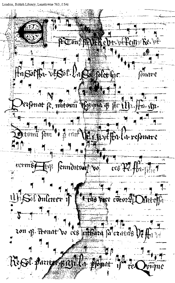 [f.[[53]]54r][London, British Library, Lansdowne 763, f.54r; text: Est Tonus sic Vt Re Vt. vel Re My Re. vel Fa Sol Fa. vel Sol. La Sol. solet hic sonare Personat semitonum vsquequaque sic Mi. Fa. Mi. Ditonum semper canit Vt. Mi. vel Fa. La. resonare cernis Atque semiditonus voces Re. Fa. siue Mi. Sol dulciter istas voce concordi Diatessaron que. intonat voces cithara sacratas Vt Fa vel Re. Sol. pariterque Mi. La. personat iste. Quinque]