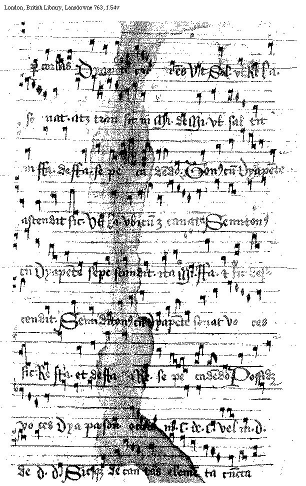 [f.[[53]]54v-] [London, British Library, Lansdowne 763, f.54v; text: per cordas Dyapente currens Vt. Sol. vel Re La. sonat. atque transit in Mi. de Mi. vel saltit in Fa. de Fa. sepe cadendo. Tonus cum Dyapente ascendit sic. Vt La. vbicumque canat. Semitonus cum Dyapente sepe scandit. ita Mi. Fa. et sic descendit. Semiditonus cum Dyapente sonat voces sic. Re Fa. et de Fa. Mi. Re sepe cadendo. Possidet voces Dyapason occoto in .C. de .C. vel in .D. de D.D. Sicque decantans elementa cuncta]