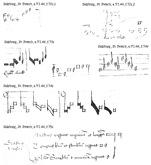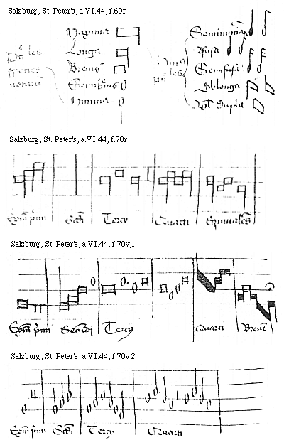 [Salzburg, St. Peter's, a.VI.44, f.69r; text: Principales species notarum, Maxima, Longa, Breuis, Semibreuis, Minima, Minus principales, Semiminima, Fusa, Semifusa, Oblonga, Vel Dupla.]