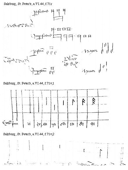 [Salzburg, St. Peter's, a.VI.44, f.71v,1; text: Exemplum primi, secundi, tercy, quarti, quinti, sexti, septimi, octaui, noni.]