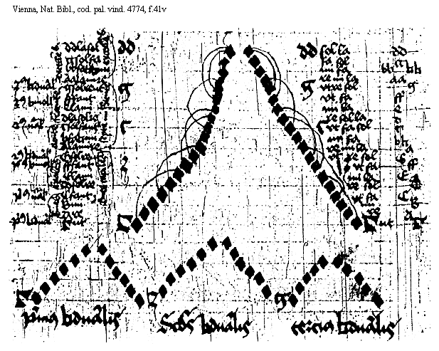 [Vienna, Nat. Bibl., cod. pal. vind. 4774, f.41v; text: primus [sqb]duralis, primus naturalis, primus bmollis, secundus [sqb]duralis, secundus naturalis, secundus bmollis, tercius [sqb]duralis, graues, finales, acutes, superacute, excellentes, [Gamma]ut, Are, Bmi, Cfaut, Dsolre, Elami, Ffaut, Gsolreut, alamire, bfa[sqb]mi, csolfaut, dlasolre, elami, ffaut, gsolreut, aalamire, bbfa[sqb][sqb]mi, ccsolfa, ddlasol, Graues capitales, septem minute acute, [signum], sol fa, fa sol, mi fa, re mi la, vt re sol, vt fa, mi la, re sol la, vt fa sol, re sol, mi, re, dd, cc, bb [sqb][sqb], aa, g, F, e, d, c, b [sqb], a, G, E, D, C, B, A, [Gamma]. Primus [sqb]duralis, Secundus [sqb]duralis]