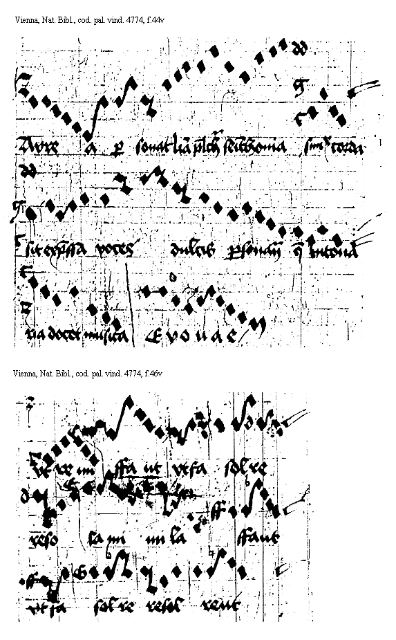 [f.44v][Vienna, Nat. Bibl., cod. pal. vind. 4774, f.44v; text: Avrea personat Nam pulchra semithonia similiter corda sit expressa voces dulcis personancii que intonaria docet musica, Evuoae]