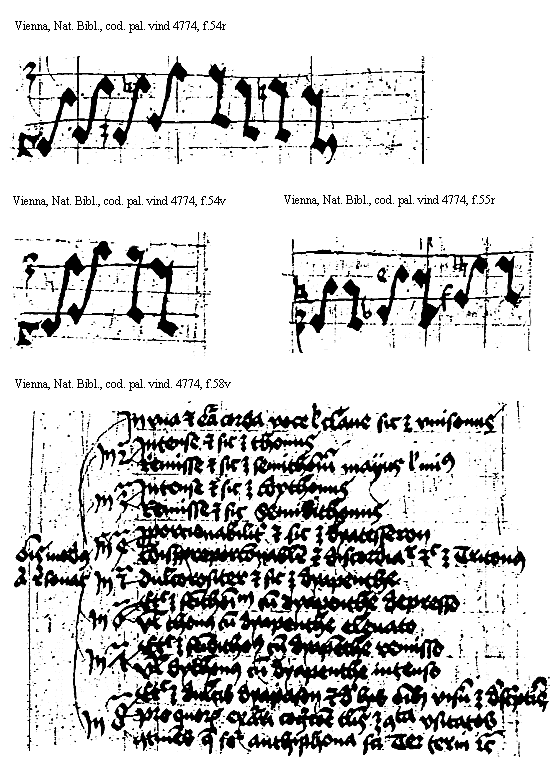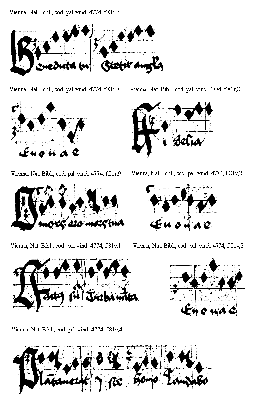 [Vienna, Nationalbibliothek, cod. pal. vind. 4774, f.83r,3; text: Ecce concipies, Alma, Omnis valle implebitur]