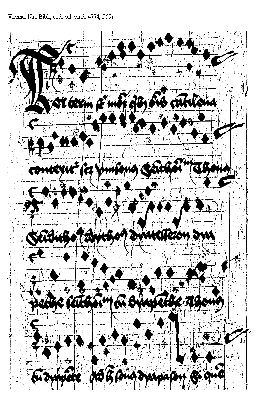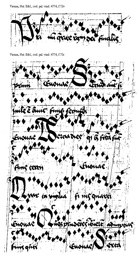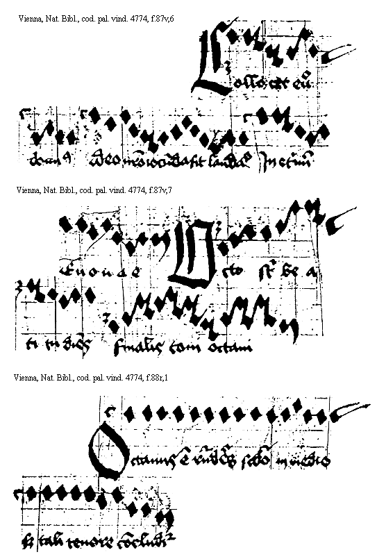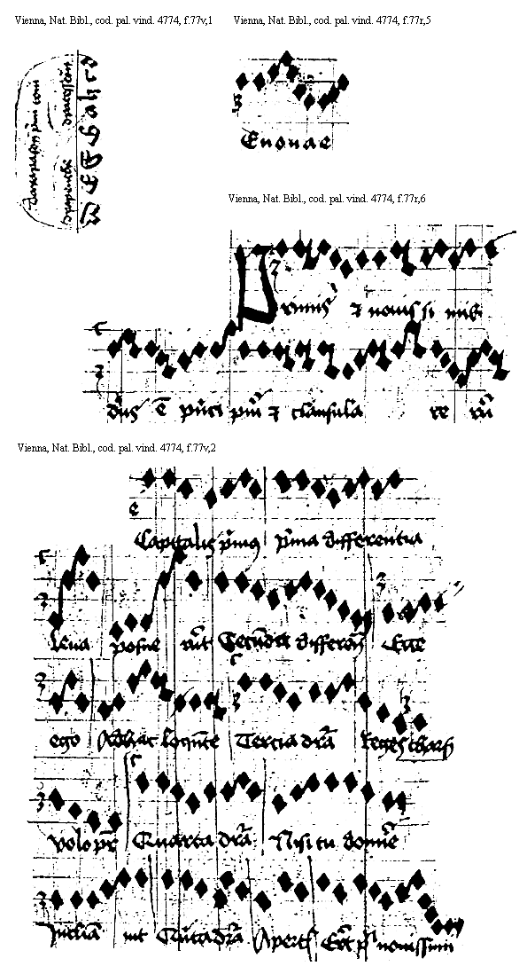 [Vienna, Nationalbibliothek, cod. pal. vind. 4774, f.80r,3; text: Tercius habet tenore tali in cantu isto tonari]