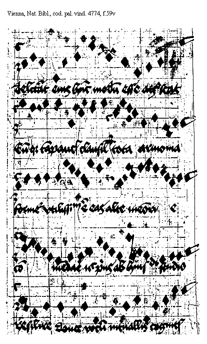 [f.59v][Vienna, Nationalbibliothek, cod. pal. vind. 4774, f.59v; text: delectant eius hunc modum esse agnoscat Eumque tam paucis clausilem [corr.] tota armonia formetur vtilissimum est eas alte memorie commendare nec prius ab huiusmodi studio resilire donec vocum interuallis cognitis]