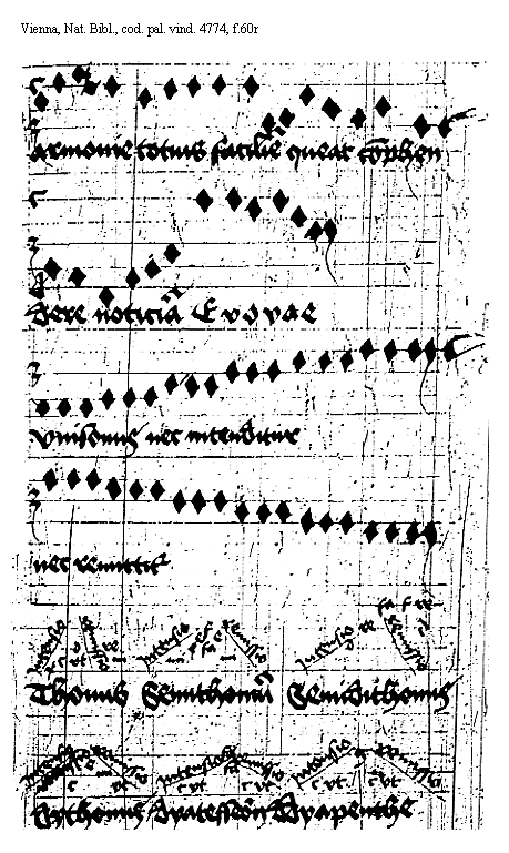 [f.60v][Vienna, Nationalbibliothek, cod. pal. vind. 4774, f.60v; text: Intensio, remissio, d, f, re, fa, vt, c, Semithonium cum dyapenthe, Thonus cum dyapente, a, la, Dypason, Sillabicatorium modorum exemplariter breuiter in notis musicis, Figura repromissa de natura dyapason in qua continentur tribus principales consonancie musice scilicet dyatesseron dyapenthe et dyapason, Thonus, Semithonium, Dythonus, Semidithonus, Dyatesseron, Dyapenthe]