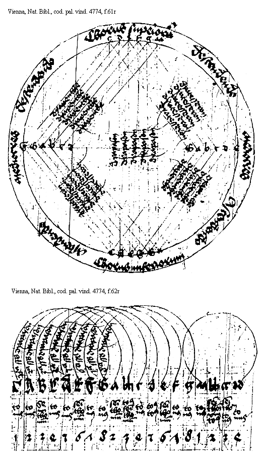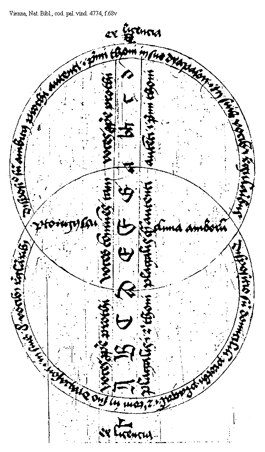 [f.68r]a acutum regulariter. licencialiter autem a [Gamma] greco vsque ad c acutum Et nota sicut dictas figuras intuenti patet quomodo quere voces proprie dicuntur plagalium. vtputa tres littere priores inferioris circuli cuiuslibet figure de numero quattuor figurarum Quere vero proprie dicuntur autentorum vt puta tres littere superioris circuli. Littere vero in medio duorum centrorum connexorum posite quarum numerus semper est quinarius. Dicuntur communes vsque thono Et sicut declaratum est de duabus figuris primi et secundi thoni. ita de singulis intelligatur/