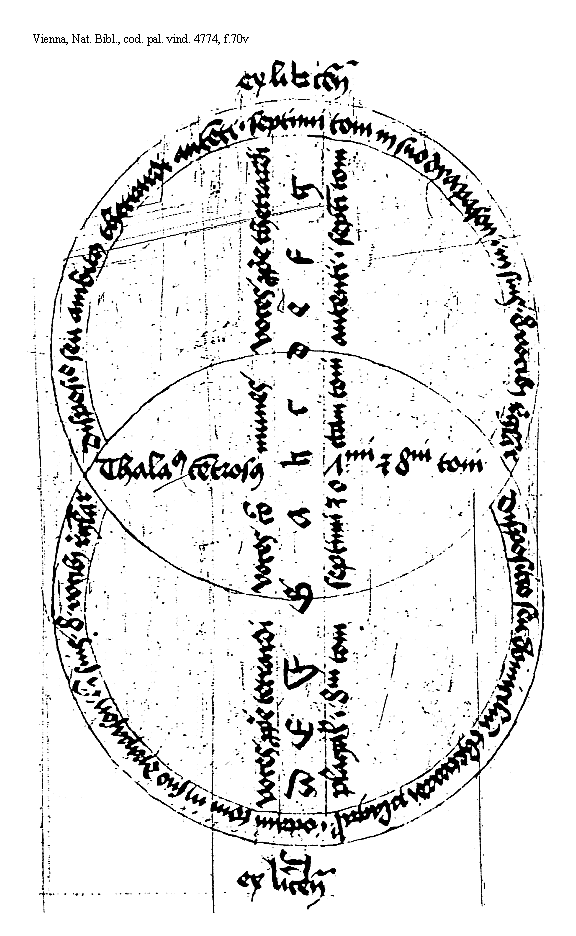 [f.70r][Vienna, Nationalbibliothek, cod. pal. vind. 4774, f.70r; text: ex licencia, Disposicio siue ambitus triti autenti id est quinti thoni in suo dyapason id est in suis octo vocibus regulariter, voces proprie triti autenti id est quinti thoni, voces communes quinti et sexti thoni, voces proprie triti plagalis id est sexti thoni, B, C, D, E, F, G, a, b, c, d, e, f, aa, Thalamus centrosus quinti et sexti thoni, Disposicio seu domicilium trithi plagalis id est sexti thoni in suo dyapason id est in suis 8 vocibus regulariter]