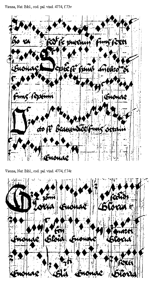 [Vienna, Nationalbibliothek, cod. pal. vind. 4774, f.87v,7; text: Euouae, Octo sunt beatitudines, finalis toni octaui]