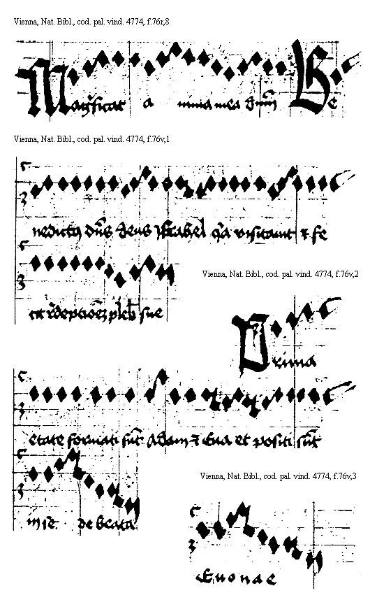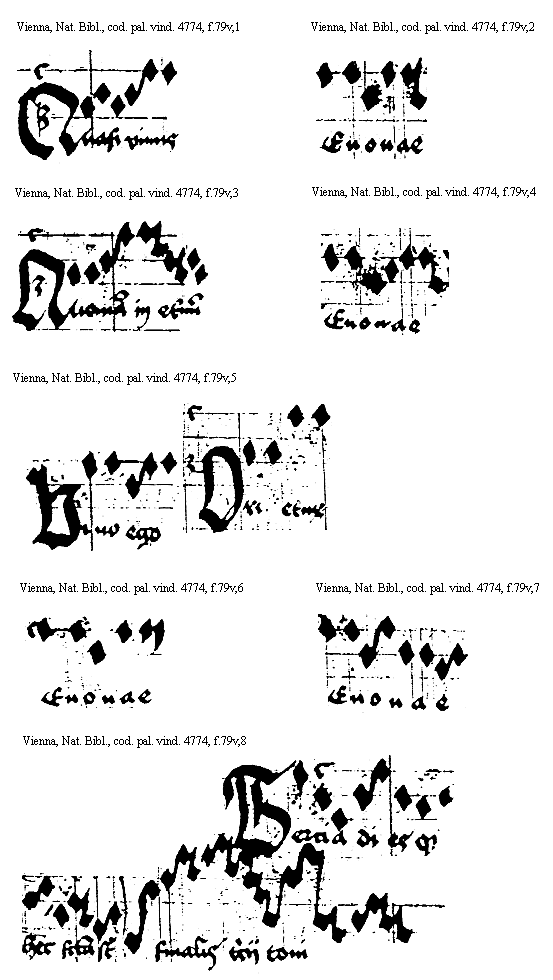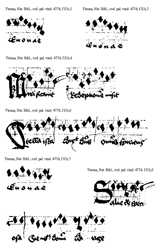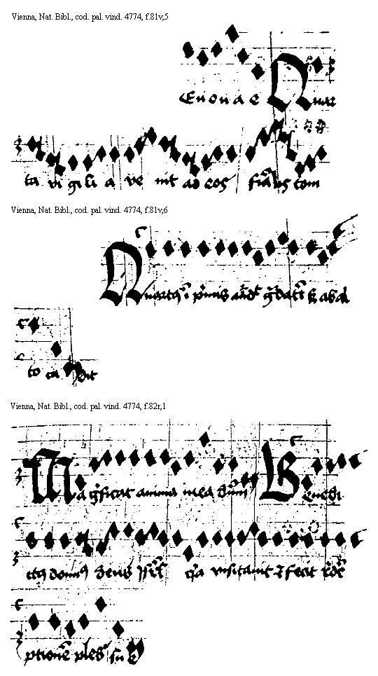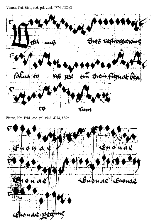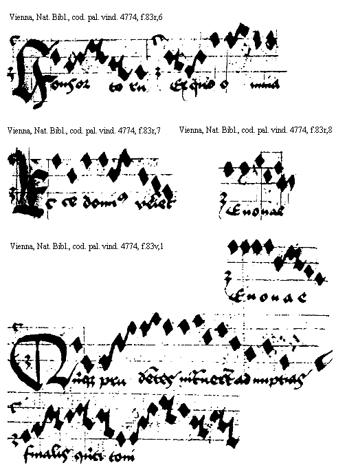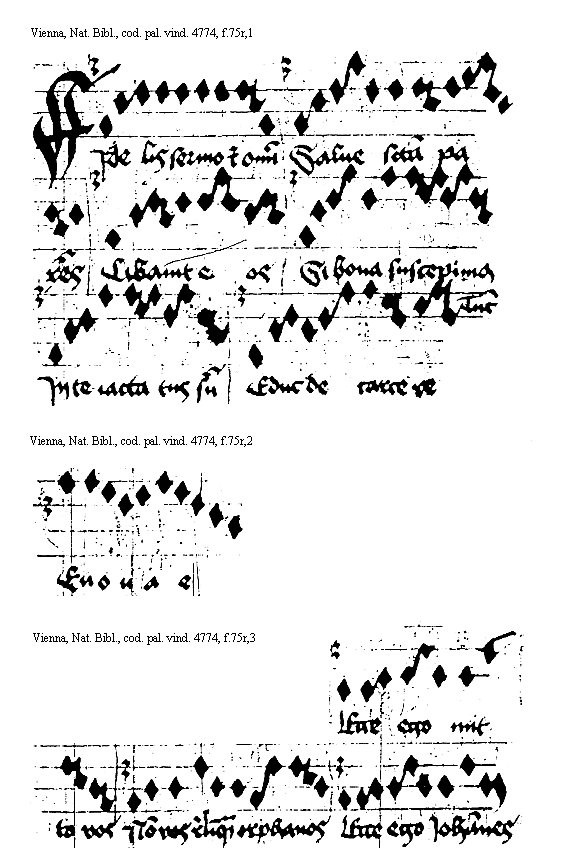 [Vienna, Nationalbibliothek, cod. pal. vind. 4774, f.79v,8; text: Tercia dies quod hec facta sunt, finalis tercii toni]