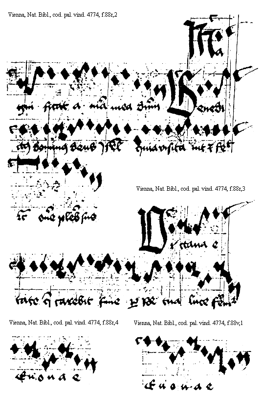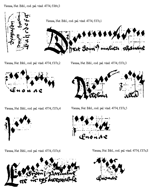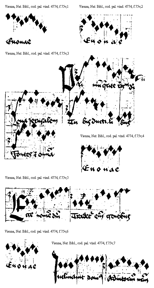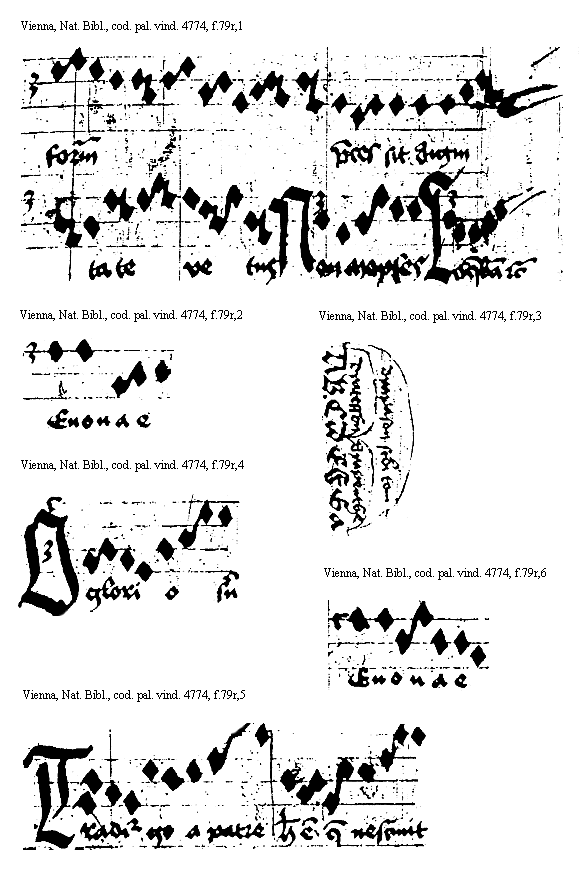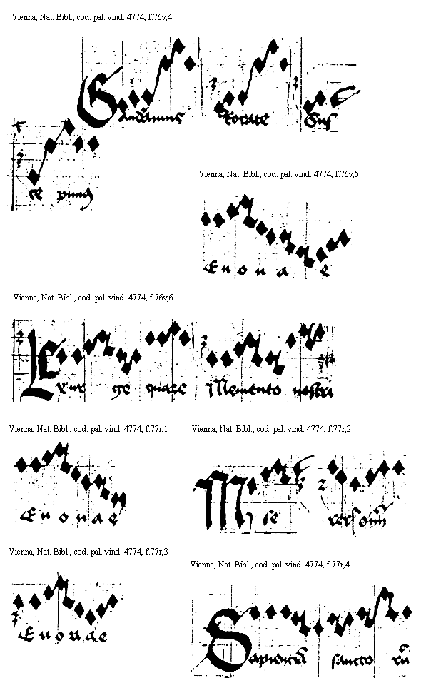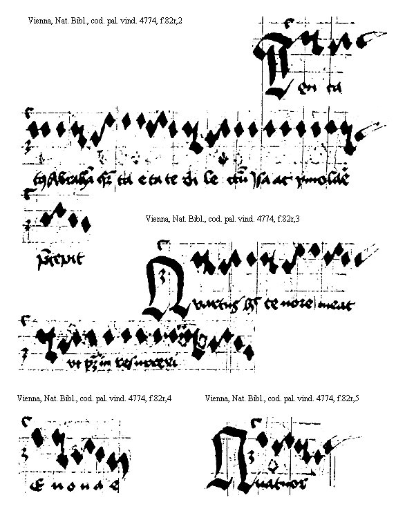 [Vienna, Nationalbibliothek, cod. pal. vind. 4774, f.79v,8; text: Tercia dies quod hec facta sunt, finalis tercii toni]