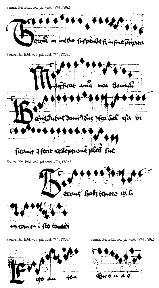 [Vienna, Nationalbibliothek, cod. pal. vind. 4774, f.80r,2; text: Magnificat anima mea dominum, Benedictus dominus deus Israhel quia visitauit et fecit redemptionem plebis sue]