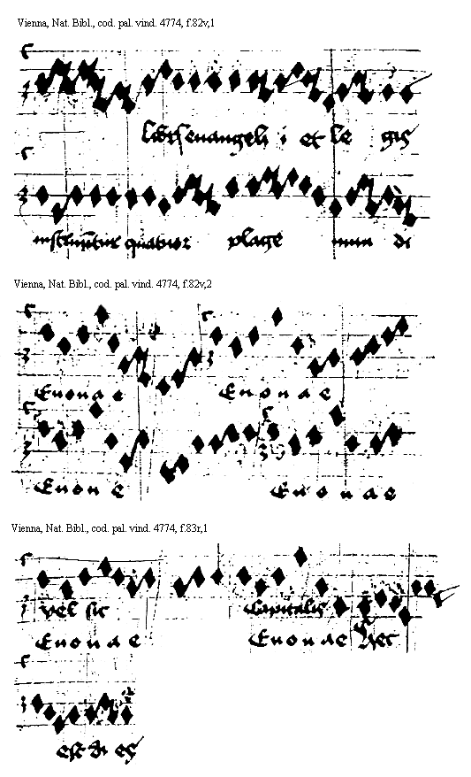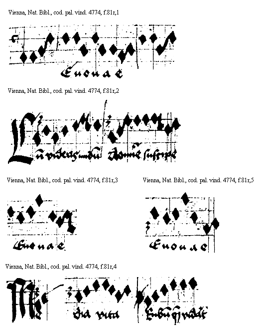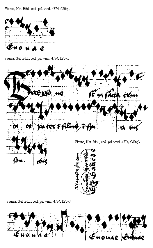 [Vienna, Nationalbibliothek, cod. pal. vind. 4774, f.81v,5; text: Euouae, Quarta vigilia venit ad eos, finalis toni]