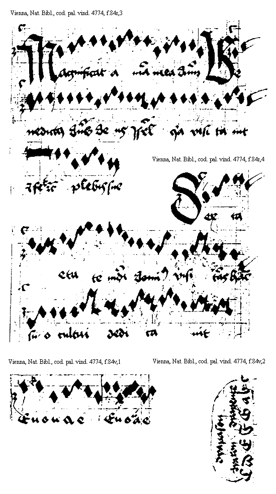 [Vienna, Nationalbibliothek, cod. pal. vind. 4774, f.83v,3; text: Magnificat anima mea dominum, Benedictus dominus deus Israel et cetera plebis sue]