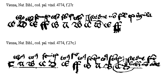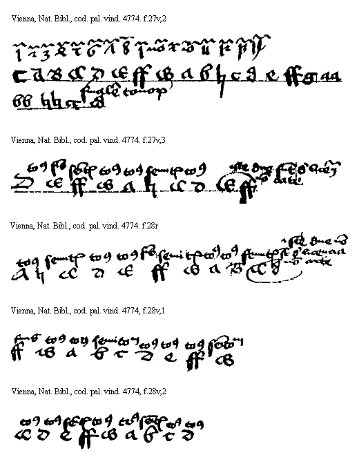 [Vienna, Nationalbibliothek, cod. pal. vind. 4774, f.27v,1; text: thonus, semitonium, [Gamma], A, B, C, D, E, F, G, Iste due sunt de licencia uero addite]