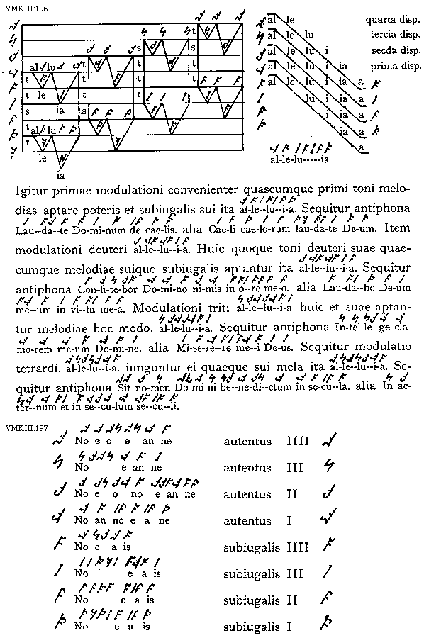 [VMKIII:196; text: alleluia, semitonium, tonus, quarta dispositio, tercia dispositio, secunda dispositio, prima dispositio, Igitur primae modulationi convenienter quascumque primi toni melodias aptare poteris et subiugalis sui ita alleluia. Sequitur antiphona, Laudate Dominum de caelis. alia Caeli caelorum laudate Deum. Item modulationi deuteri alleluia. Huic quoque toni deuteri suae quaecumque melodiae suique subiugalis aptantur ita alleluia. Sequitur antiphona Confitebor Domino nimis in ore meo. alia Laudabo Deum meum in vita mea. Modulationi triti alleluia huic et suae aptantur melodiae hoc modo. alleluia. Sequitur antiphona Intellege clamorem meum Domine. alia Miserere mei Deus. Sequitur modulatio tetrardi alleluia. iunguntur ei quaeque sui mela ita alleluia. Sequitur antiphona Sit nomen Domini benedictum in secula. alia In aeternum et in seculum seculi.]