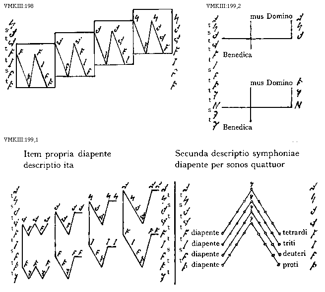 [VMKIII:199,1; text: Item propria diapente descriptio ita, Secunda descriptio symphoniae diapente per sonos quattuor, tonus, semitonium, diapente, tetrardi, triti, deuteri, proti]