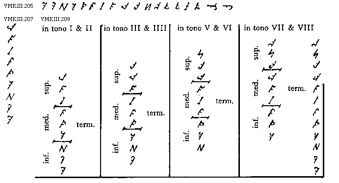 [VMKIII:209; text: in tono primo et secundo, in tono tercio et quarto, in tono quinto et sexto, in tono septimo et octavo, inferior, medium, superior, terminalis]