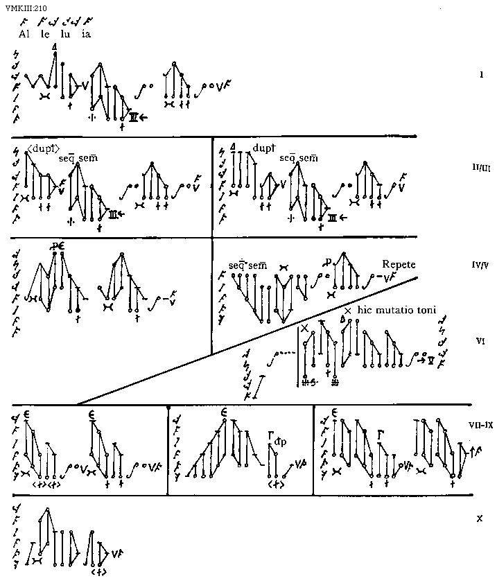 [210][VMKIII:210; text: Alleluia, duplum, sesquisemitonium, Repete, hic mutatio toni, I, II/III, IV/V, VI, VII-IX, X]
