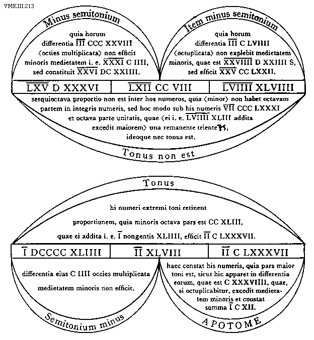 [213][VMKIII:213; text: Minus semitonium, quia horum differentia III[macron supra lin.] CCC XXVIII octies multiplicata non efficit minoris medietatem id est XXXI[macron supra lin.] C IIII, sed constituit XXVI[macron supra lin.] DC XXIIII. Item minus semitonium, quia horum differentia III[macron supra lin.] C LVIIII octuplicata non explebit medietatem minoris, quae est XXVIIII[macron supra lin.] D XXIIII S, sed efficit XXV[macron supra lin.] CC LXXII. LXV[macron supra lin.] D XXXVI, LXII[macron supra lin.] CC VIII, LVIIII[macron supra lin.] XL VIIII, sesquioctava proportio non est inter hos numeros, quia minor non habet octavam partem in integris numeris, sed hoc modo sub his numeris VII[macron supra lin.] CCC LXXXI et octava parte unitatis, quae ei id est LVIIII[macron supra lin.] XLIII addita excedit maiorem una remanente triente, ideoque nec tonus est. Tonus non est, Tonus, hi numeri extremi toni retinent proportione, quia minoris octava pars est CC XLIII, quae ei addita id est I[macron supra lin.] nongentis XLIIII, efficit II[macron supra lin.] C LXXXVII. I[macron supra lin.] DCCCC XLIIII, II[macron supra lin.] XLVIII, II[macron supra lin.] C LXXXVII, differentia eius C IIII occies multiplicata medietatem minoris non efficit. Semitonium minus, haec constat his numeris, quia pars maior toni est, sicut hic apparet in differentia eorum, quae est C XXXVIIII, quae, si octuplicabitur, excedit medietatem minoris et constat summa I[macron supra lin.] C XII. APOTOME [descriptio 4, descriptio 5 in marg.]]