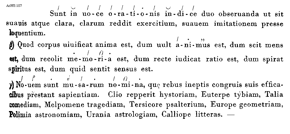 [alpha]) (fol. 19'') [AcM5:107; text: Sunt in uoce orationis indice duo obseruanda ut sit suauis atque clara, clarum reddit exercitium, suauem imitationem presse loquentium. [beta]) Quod corpus uiuificat anima est, dum uult animus est, dum scit mens est, dum recolit memoria est, dum recte iudicat ratio est, dum spirat spiritus est, dum quid sentit sensus est. [gamma]) Nouem sunt musarum nomina que rebus ineptis congruis suis efficacibus prestant sapientiam. Clio repperit hystoriam, Euterpe tybiam, Talia comediam, Melpomene tragediam, Tersicore psalterium, Europe geometriam, Polimia astronomiam, Urania astrologiam, Calliope litteras. --]