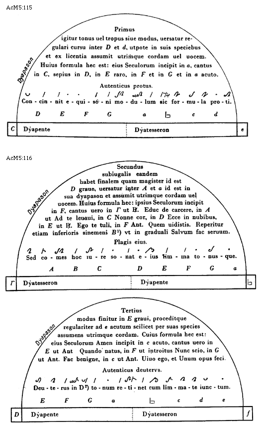 [AcM5:115; text: Primus igitur tonus uel tropus siue modus, uersatur regulari cursu inter D et d, utpote in suis speciebus et ex licentia assumit utrimque cordam uel uocem. Huius formula hec est: eius Seculorum incipit in a, cantus in C, sepius in D, in E raro, in F et in G et in a acuto. Autenticus protus. Dyapason, Dyapente, Dyatesseron, Concinnit equisoni modulum sic formula proti. C, D, E, F, G, a, [sqb], c, d, e]