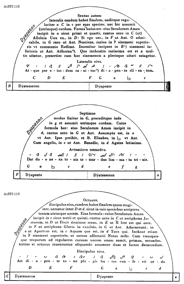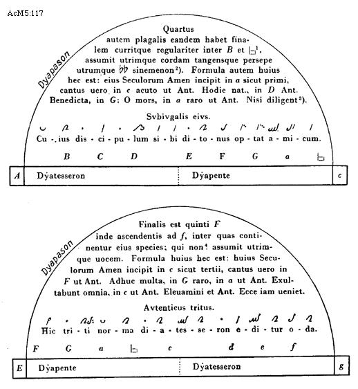 [117][AcM5:117; text: Quartus autem plagalis eandem habet finalem curritque regulariter inter B et [sqb], assumit utrimque cordam tangensque persepe utrumque [rob][rob] sinemenon. Formula autem huius hec est: eius Seculorum Amen incipit in a sicut primi, cantus uero in c acuto ut Antiphona Hodie natus, in D Antiphona Benedicta, in G: O mors, in a raro ut Antiphona Nisi diligent. Svbivgalis eivs. Dyapason, Dyapente, Dyatesseron, A, B, C, D, E, F, G, a, [sqb], c, d, e, f, g, Cuius discipulum sibi ditonus optat amicum. Finalis est quinti F inde ascendentis ad f, inter quas continentur eius species; qui non assumit utrimque uocem. Formula huius hec est: huius Seculorum Amen incipit in c sicut tertii, cantus uero in F ut Antiphona Adhuc multa, in G raro, in a ut Antiphona Exultabunt omnia, in c ut Antiphona Eleuamini et Antiphona Ecce iam ueniet. Avtenticus tritus. Hic triti norma diatesseron editur oda.]