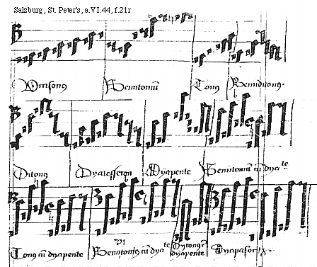 [Salzburg, St. Peter's, a.VI.44, f.21r; text: Vnisonus, Semitonium, Tonus, Semiditonus. Ditonus, Dyatesseron, Dyapente, Semitonium cum dyapente, Tonus cum dyapente, Semiditonus cum dyapente, Dytonus cum dyapente, Dyapason.]