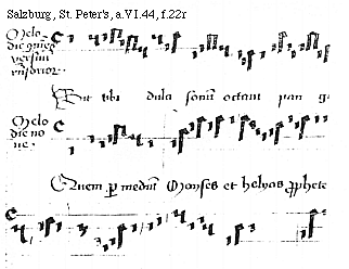 [f.22r][Salzburg, St. Peter's, a.VI.44, f.22r; text: Melodie continens versuum responsoriorum, Sit tibi dulci sonum octaui pangito versum. Melodie none. Quem per medium. Moyses et Helyas prophete, In mortalis est enim. Clamdiu quippe salutaris ille liquor. Benedictus es Domine.]