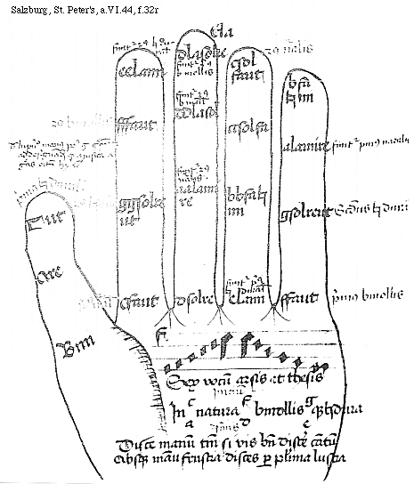 [f.31r]manus sinistre quelibet clauis debeat poni sew locari. Accipe hoc breuiter metris sequentibus. et persequentem manualem figuram depictam. vnde versus