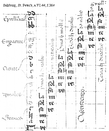 [Salzburg, St. Peter's, a.VI.44, f.36v; text: Graues, Finales, Acute, Superacute, Excellentes, [Gamma], a, [sqb], c, d, e, f, g, b, ee, ff, gg, aa, bb, cc, dd, vt, re, mi, fa, sol, la, primus [sqb] duralis, primus naturalis, Primus b mollis, Secundus [sqb] duralis, secundus naturalis, secundus b mollis, Tercius [sqb] duralis.]