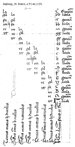 [Salzburg, St. Peter's, a.VI.44, f.35v,3; text: tercius [sqb] duralis, vt, re, mi, fa, soll, sol.]