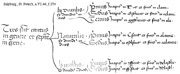 [f.37v][Salzburg, St. Peter's, a.VI.44, f.37v; text: Tres sunt cantus in genere et septem in specie. [sqb] duralis. Et diuiditur in tres, Naturalis. Et diuiditur in duos, b mollis. Primus, Secundus, Tercius, Incipitur in [Gamma]ut et finitur in elami. Incipitur in Gsolreut et finitur in eelami. Incipitur in ggsolreut et finitur in ela. Incipitur in Cfaut et finitur in alamire. Incipitur in csolfaut et finitur in aalamire. Incipitur in Ffaut et finitur in delasolre. Incipitur in FFfaut et finitur in ddlasol.]