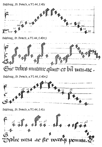 [Salzburg, St. Peter's, a.VI.44, f.40v,2; text: sol, re, la.]