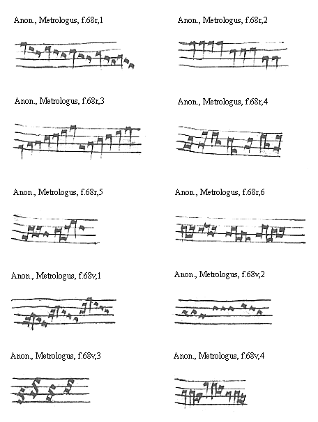 LIcet enim longas et breues nominemus non sic tenentur in plana musica. sicut et in organo. sed omnes note preter pausaciones. streinant et molosus equaliter cantentur sicut inferius patebit. Ad nichil aliud deseruiunt nisi tantum ad ornamentum. ita ut in vnum terminentur partes et distincciones neumarum atque verborum nec tenor longus. in quibus breuibus sillabis