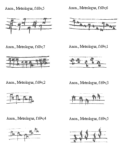 [f.68r]est si ita sit neumarum et distinccionum moderatas uarietas. ut cum neume neumis. et distincciones distinccionibus. quadam semper similitudine sibi consonanter respondeant. vel sit similitudo dissimilis more predulcis Ambrosii. Non autem parua similitudo est metris et cantibus cum neume loco [locam ante corr.] sunt pedum. et distincciones loco sunt versuum. utpote ista neuma dactilico illa vero spondaico. alia vero iambico more decurrant et distinccionem nunc tetrametram nunc pentametram. alias quasi exametras cernas et multa alia ad hunc modum.