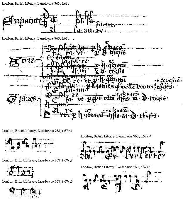 [London, British Library, Lansdowne 763, f.61v; text: Superacute. A la. mi. re. B fa. mi. C sol. fa. D la sol]