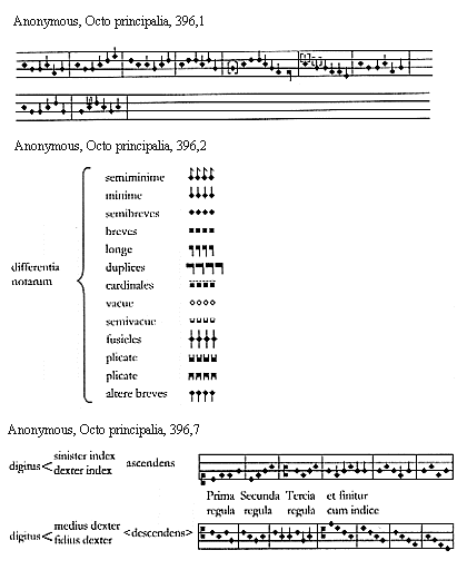 [397]Nota: quelibet duplex valet duas longas; et quelibet longa duas breves; et quelibet brevis valet duas semibreves; et quelibet semibrevis valet duas minimas; et quelibet minima valet duas semiminimas. Et ergo per regulam logicalem, quando alterum de altero predicatur ut de subiecto, quecumque et cetera.