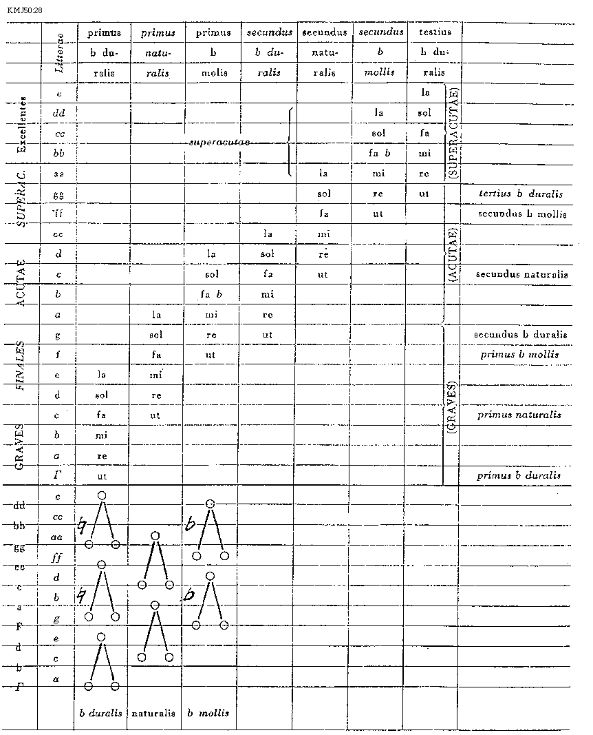[KMJ50:28; text: GRAVES, FINALES, ACUTAE, SUPERACUTAE, Excellentes, Litterae, primus b duralis, primus naturalis, primus b mollis, molis, Secundus b duralis, secundus naturalis, secundus b mollis, testius, tertius b duralis, [sqb], [rob], [Gamma], F, [Gamma] ut, a re, b mi, c fa ut, d sol re, e la mi, f fa ut, g sol re ut, a la mi re, b fa b mi, c sol fa ut, d la sol re, ee la mi, ff fa ut, gg sol re ut, aa la mi re, bb fa b mi, cc sol fa, dd la sol, e la]