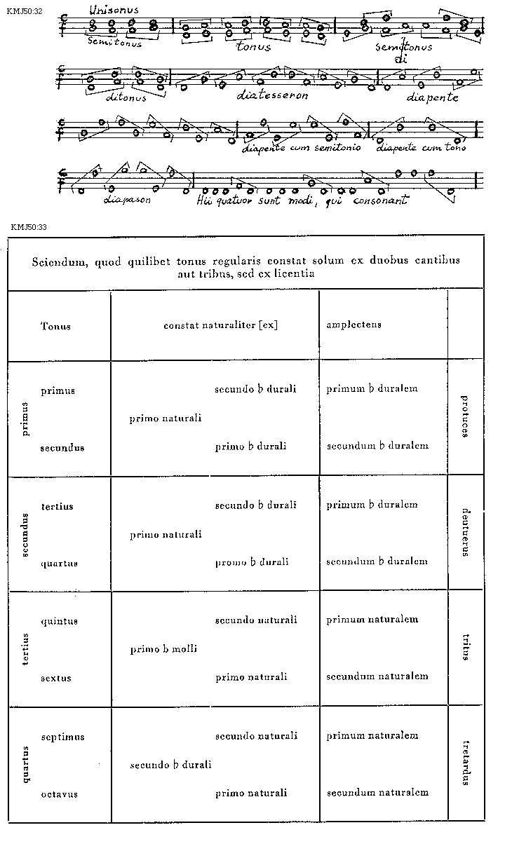 [KMJ50:32; text: Unisonus, Semitonus, tonus, semiditonus, ditonus, diatesseron, diapente, diapente cum semitonio, diapente cum tono, diapason, Hii quatuor sunt modi, qui consonant]
